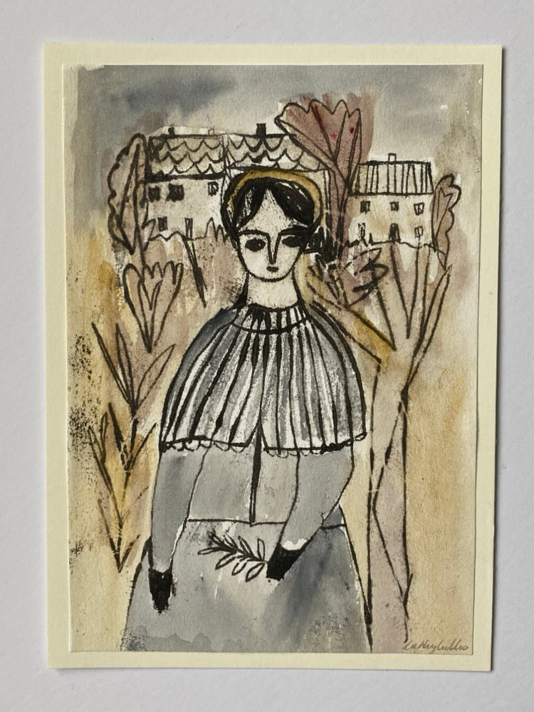 Autumn landscape with woman in grey