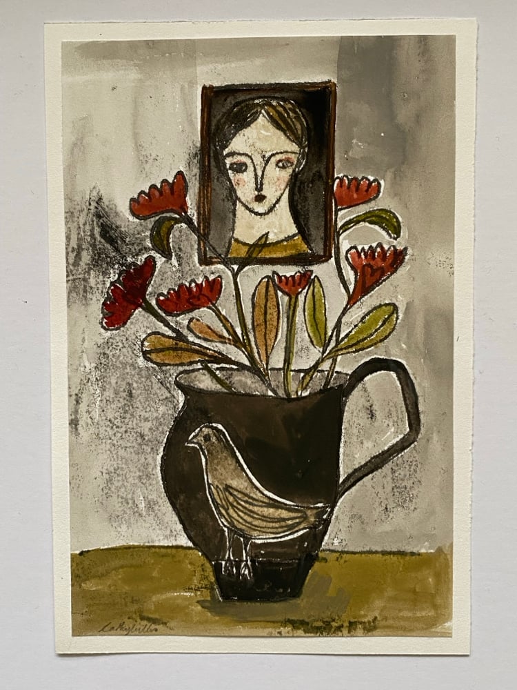 Bird jug with portrait - monoprint artwork
