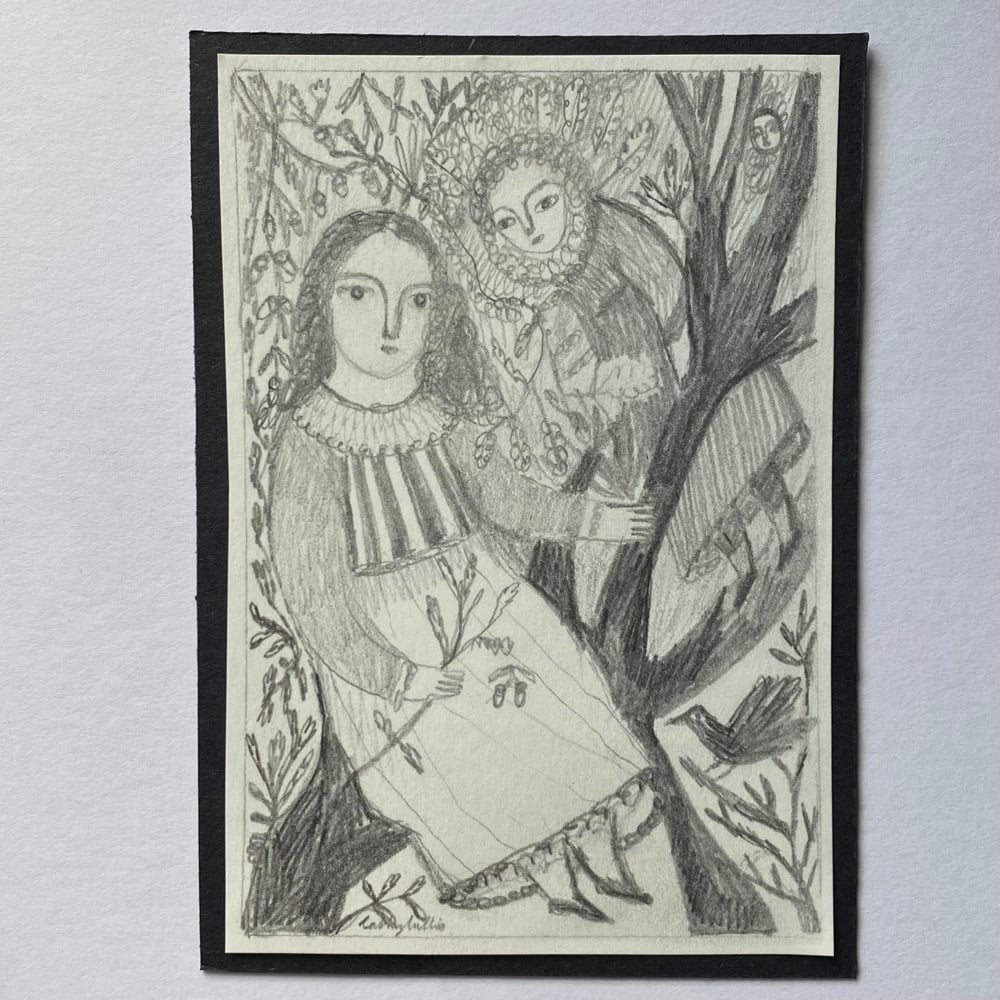 This smaller original work in pencil is on warm white paper and has a backing of black card.