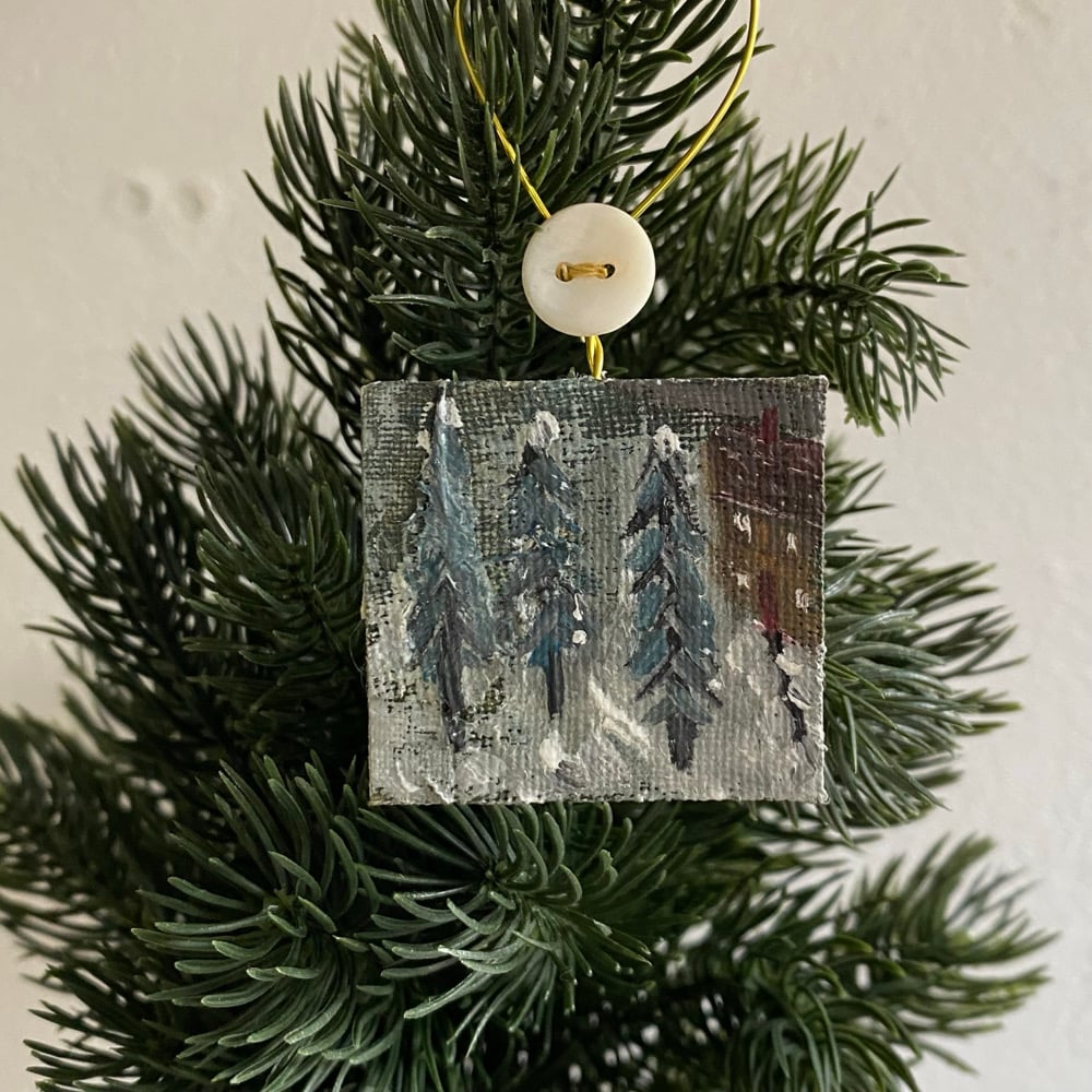 this miniature work has been designed with winter display in mind. The painting has a gold-coloured wire loop for hanging secured on the reverse. There is a vintage mother of pearl button sewn on to the wire.