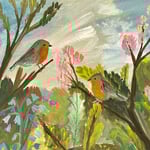 Two robins in a spring wild garden
